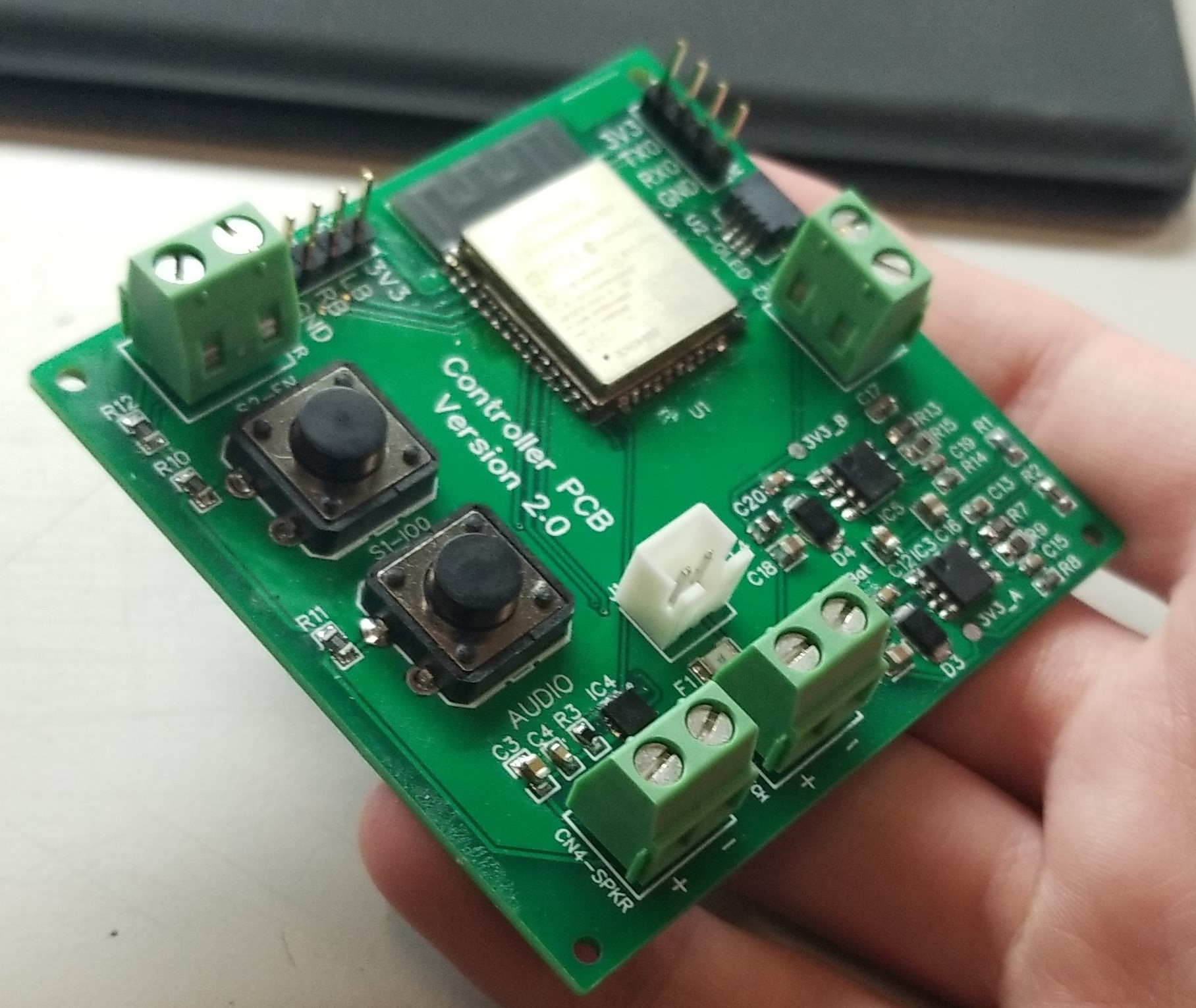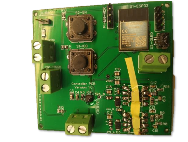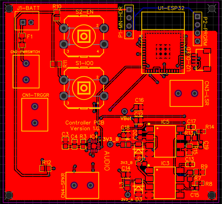 This one worked! Mostly. Once again, we had some issues with it, but the Controller board worked perfectly once fully assembled. Voltage regulators were stable enough, we were able to communicate and program the MCU, and even got the audio and laser working! Great!