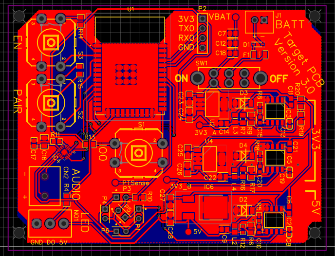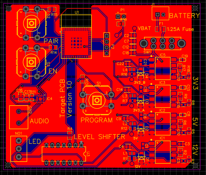 Target did not work! At least, not with the power anyway. We'd see instances where we'd have one or two regulators work, but never the 3V3 lines, and never at the same time. We could still talk with the MCU, as long as we powered it from our FTDI programmer, but we couldn't power the accessories without an external power supply running at the required voltage.