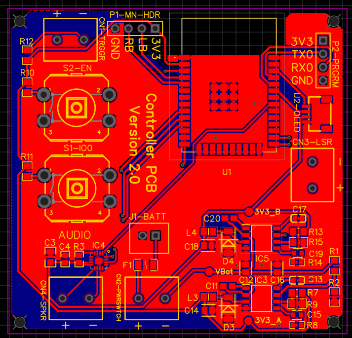 On shape: the controller board was intentionally made long, as to fit in the barrel of a laser pistol. Since I'd be responsible for the enclosure design, I knew that I'd be able to adjust the 3D printed enclosure much easier and cheaper than manufacturing a new PCB, so I decided to just minimize the boards as much as possible then design around them. You can read about how that turned out on the "Enclosure Design" page.