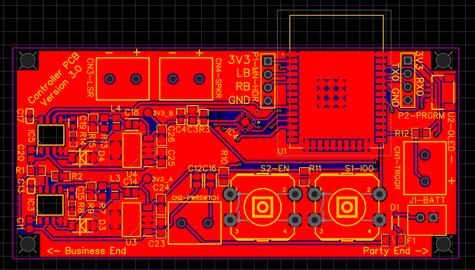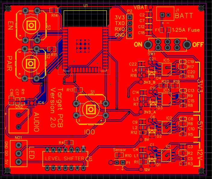 Getting to design PCBs was an enlightening experience for me. I, personally, found it really interesting and peaceful to layout parts and routes, solving problems with routing on simple 2-layer PCBs. I wish we had done a bit more work to improve the overall electrical functionality of the device (try fix the audio/lighting problems on targets, include battery charging, change to a smaller form-factor battery), but I'm satisfied with what we ultimately made.