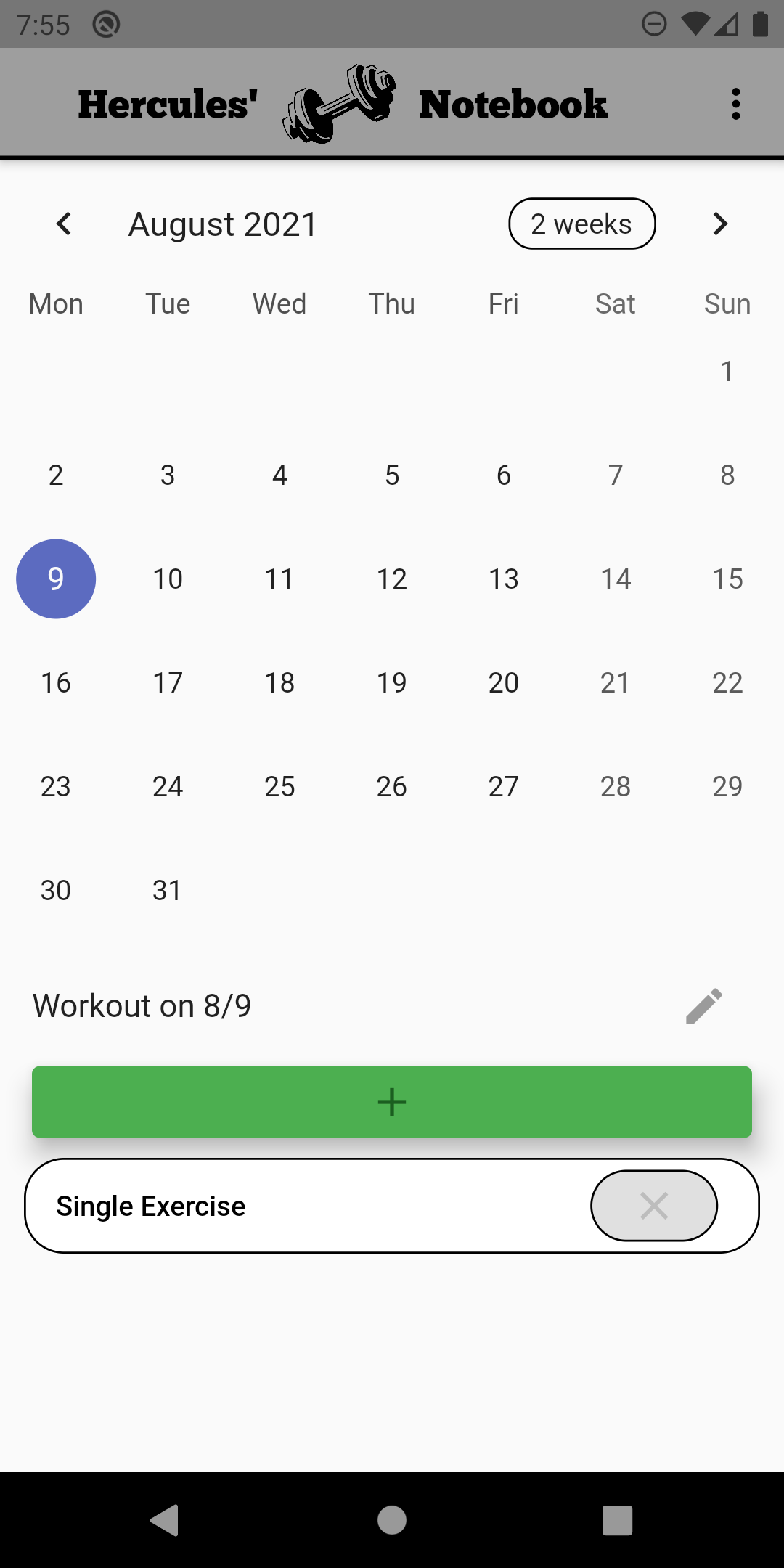 The main interface is fairly similar to the web application - unfortunately, we couldn't get the same bold highlighting the web interface has for custom/empty days, but the content is still there. Clicking on any given day loads the exercises for that day at the bottom half of the interface, with the plus button to add a custom workout or a new exercise to the existing custom workout.