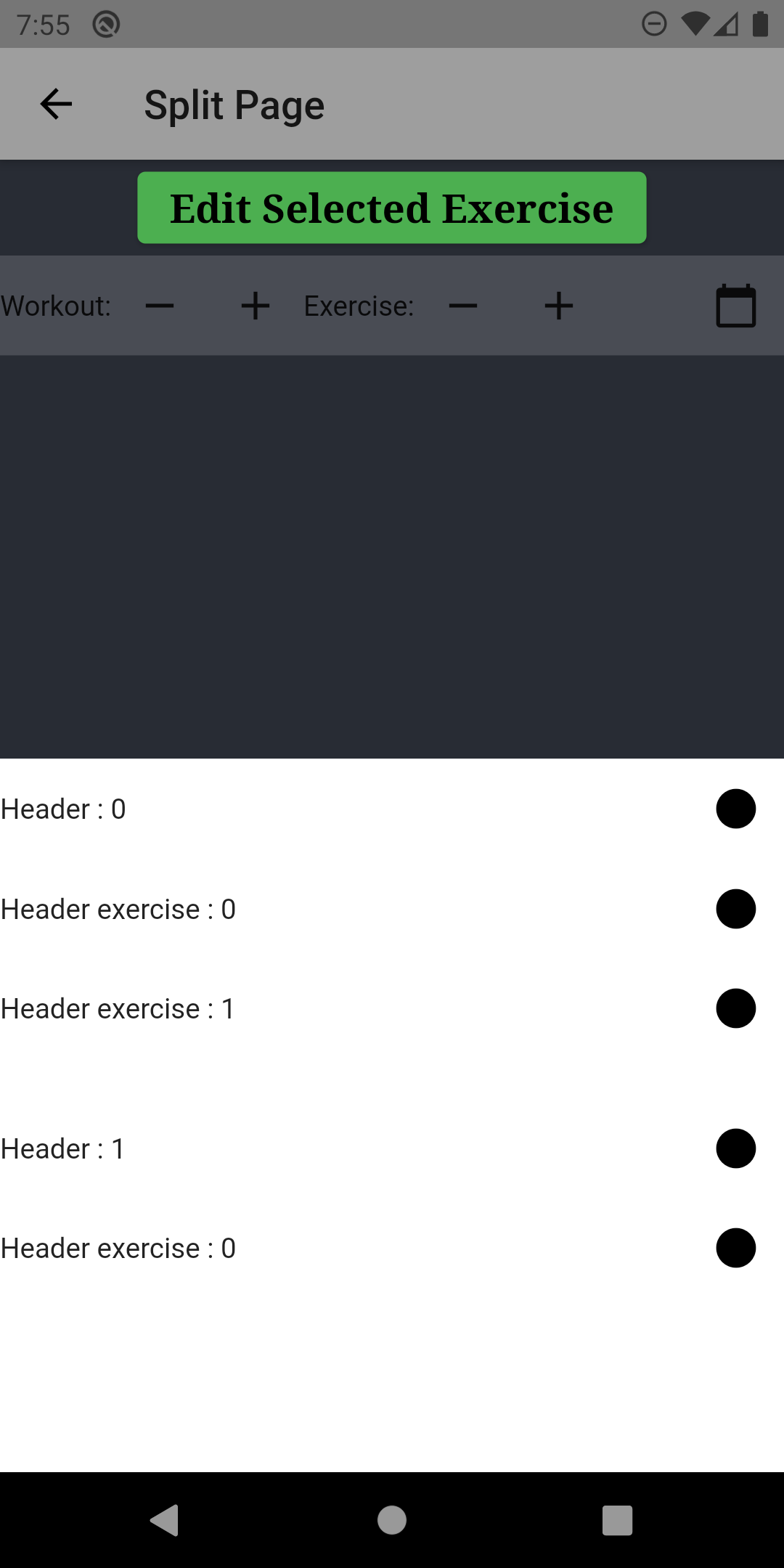 (These screenshots were from an earlier build of the application - The index number following the "Header" or "Header exercise" strings were eventually replaced with the name of the workout / exercise).