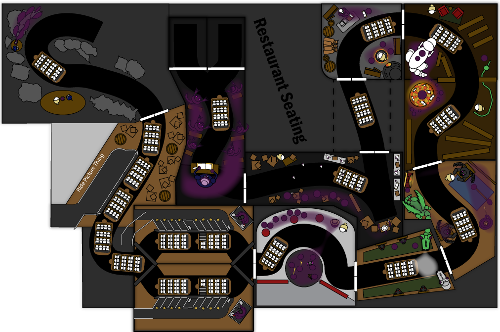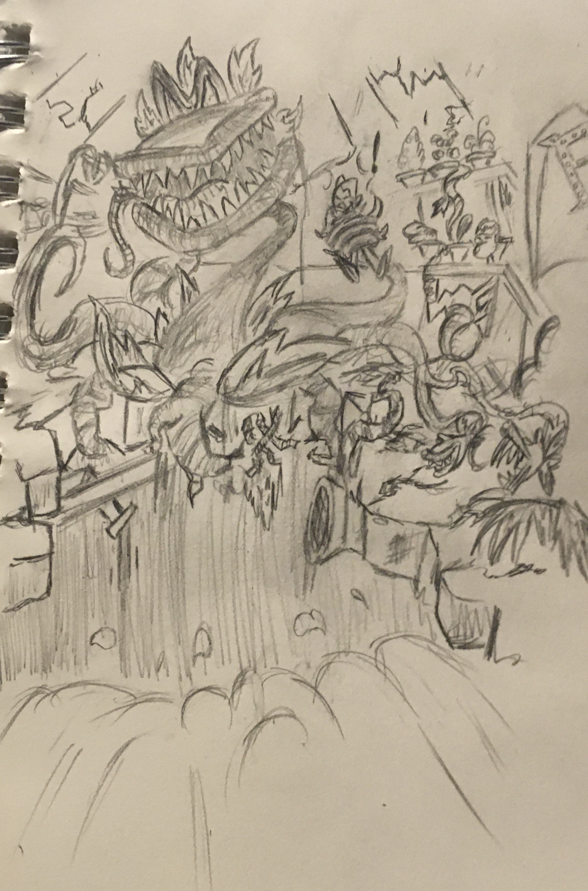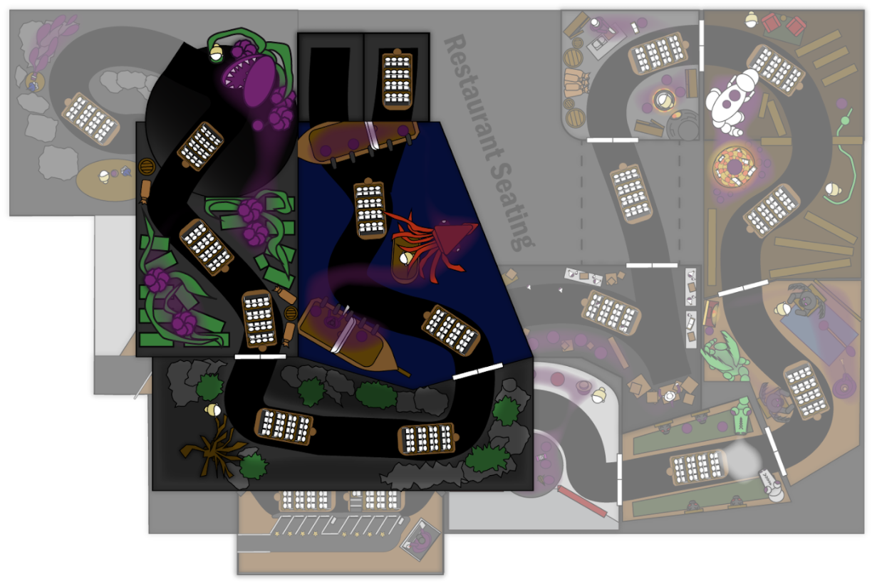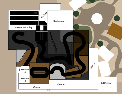 Jacob had written out and sketched several vignettes of scenes that guests would experience over the course of the attraction, alongside the story itself. This was a massive help in the planning phase of the layout, as the layout process ended up being pretty straightforward, after starting.