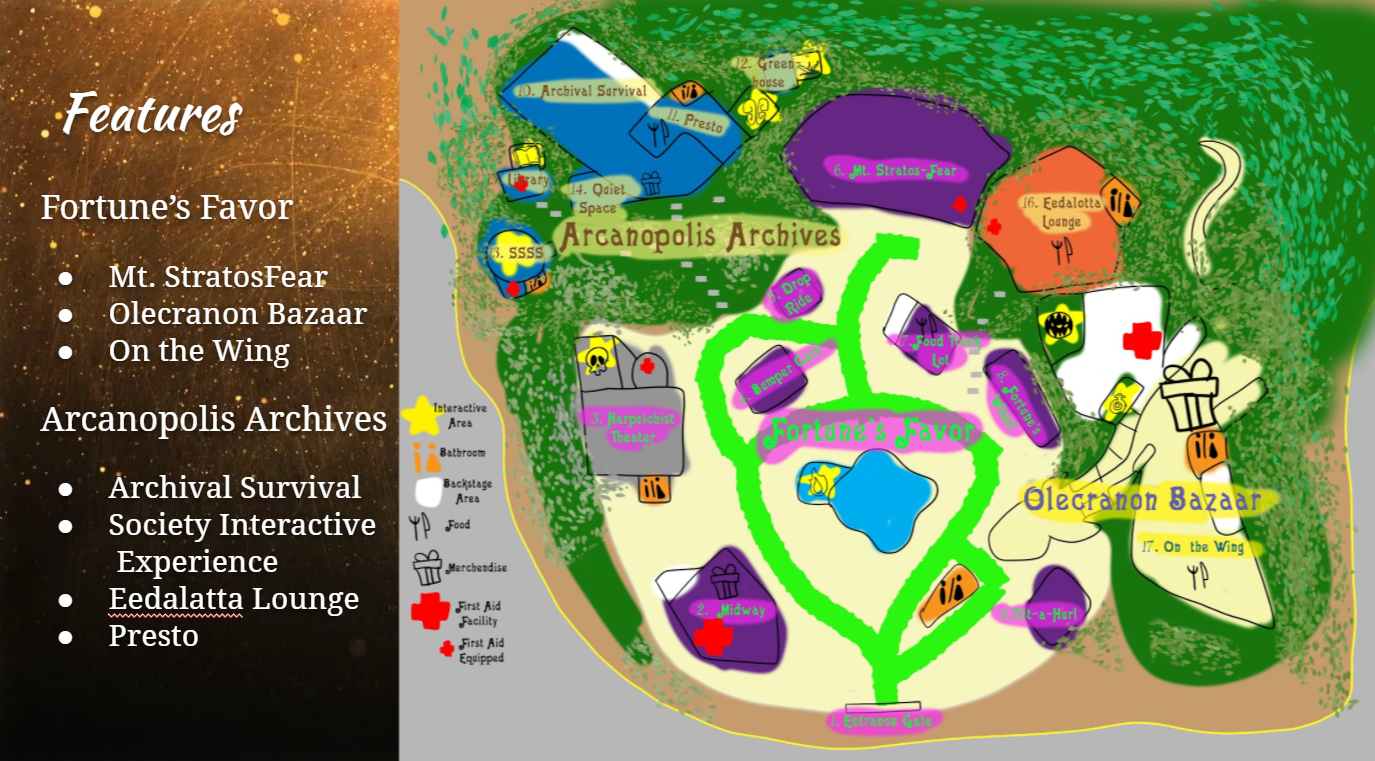 Over the Fall semester of 2020, I participated in the TEA@UCF fall design competition - a competition during which several small teams were given a prompt, to which they were to design a theme park land fitting that prompt, incorporating a coaster, a dark ride, a few flat rides, and the necessary knickknacks that befit a land. The prompt for the competition was "Other Worlds," a very wide-open prompt that led to my group - the winning group - creating a mystical land depicting a conflict between a bumbling wizard's attempt at scholarship and a conniving business-lady's money-making scheme: Hocus Hollow