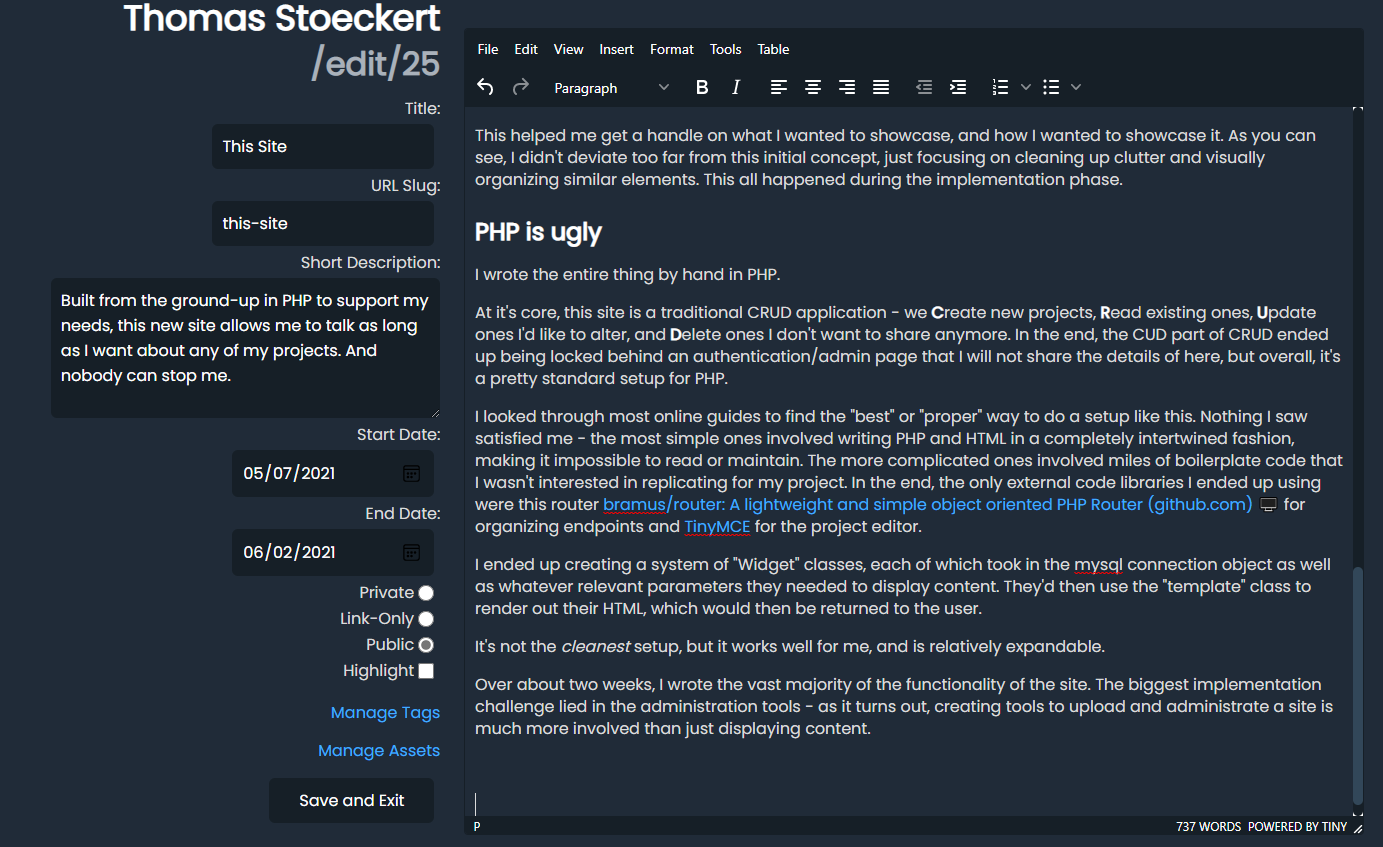 Most of the stuff is pretty standard, with the exception of the tags/assets system. These are two (technically three) other tables in the database which manage the many-to-many relationship that tags have, as well as the one-to-many relationship that any project has with its assets. These links open up modal dialogues which allow me to create, link/unlink tags, and upload and insert assets into any given point in the editor.